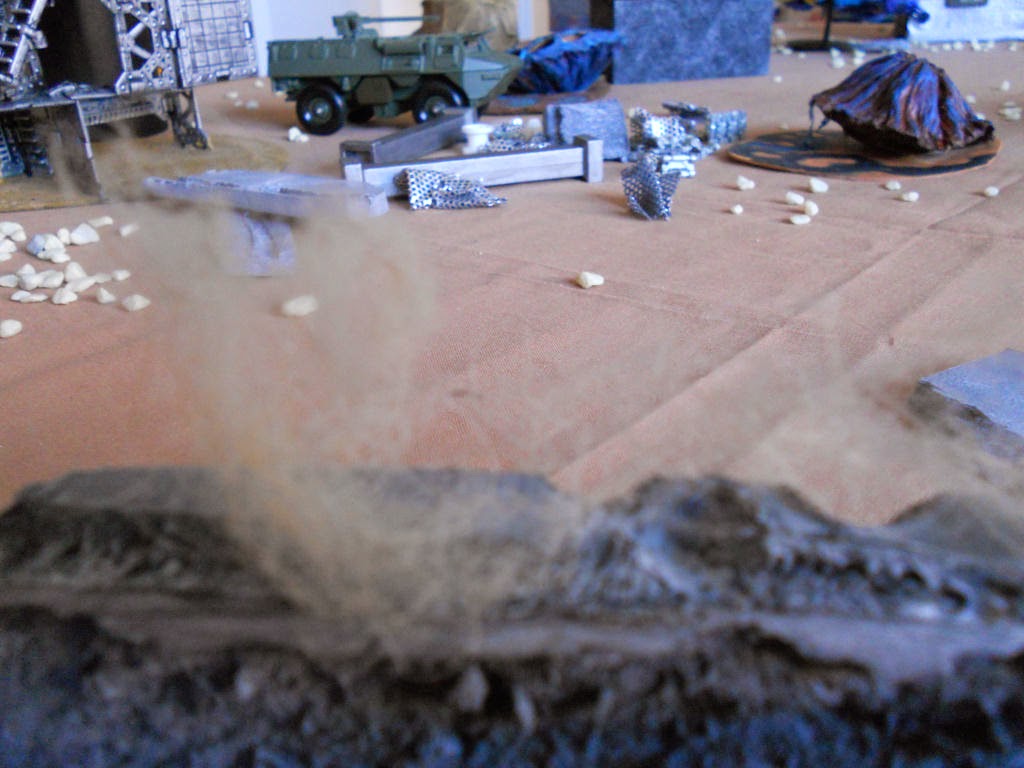 Le déploiement d'un escouade supplémentaire de Kroots tourna au fiasco. Ils s'abritèrent derrière un mur qui, sous les tirs de l'X-AC, fut transformé en passoire. Bilan : 2 morts, une fuite hors table, et le 4ème Kroot en repli.